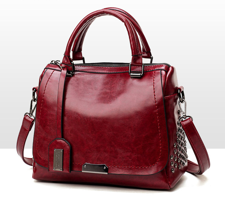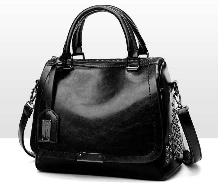 Women's Studded Large Capacity Handbag Oil Leather Boston Bag